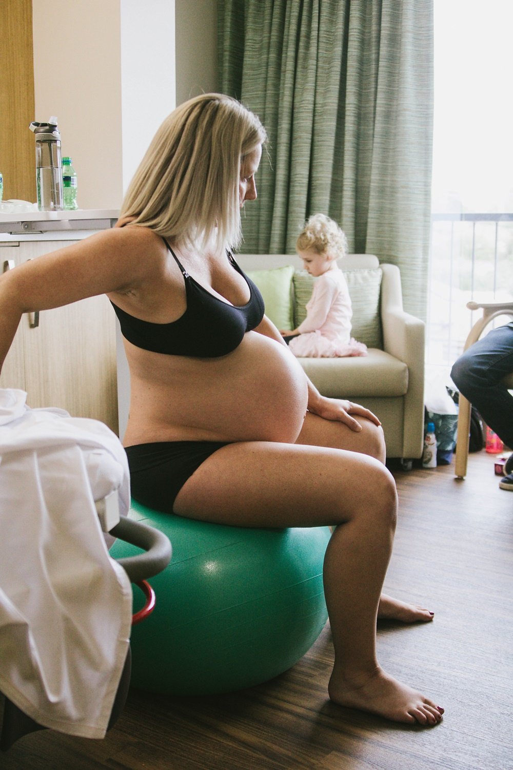 Our dear friend & photographer Jules turned up, the room felt calm and relaxed. Liana was calm playing while every so often coming over to check if I was okay. Meanwhile Jarrod & I were getting our heads around that we were about to become parents again!! I was mostly back & forth from my bed & the fit ball during my braxtons/contractions which were about 10 mins apart. The midwives had a bit of a giggle that I still referred to them as braxtons as they could see on the monitoring screens they were getting more intense.