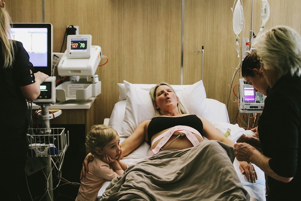 My obstetrician came in to check my progress & to see if I wanted him to break my waters to get things happening! He would let us discuss and come back. This decision was confusing to me, there was part of me thinking that right now I was feeling nothing and it felt like I could end up being here all day and night. Which is the last thing I wanted. I was still trying to get my head around that I was in labour but my waters hadn’t broken as my first birth this was the first thing that happened.Plus Liana was with us and I wanted her to still be functional to get through this to see her little brother arrive.I could feel the midwives probably didn’t want me to get my waters broken and would have preferred it all to happen naturally.I just could not feel anything progressing at this stage and decided to let my ob break my waters. He put a single finger glove on with the tiniest little hook at the end and scratched my membranes which then broke. My next bathroom stop there was a lot of blood including some large clots. The midwives started to get worried about how much blood I was now losing & called the ob back in. They estimated I’d lost around 500 mls.