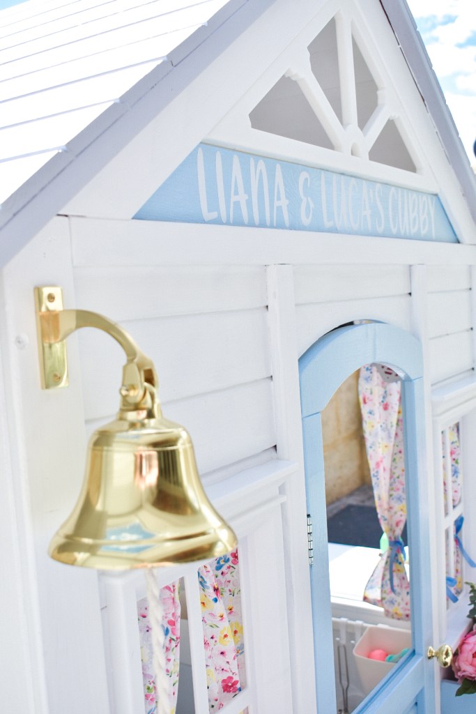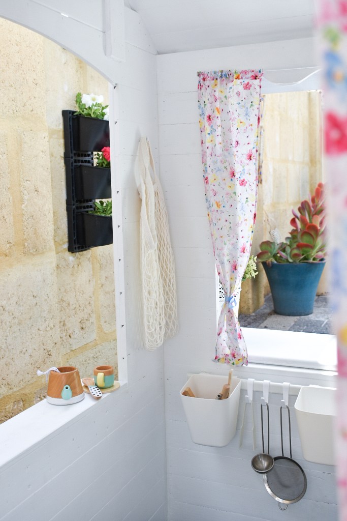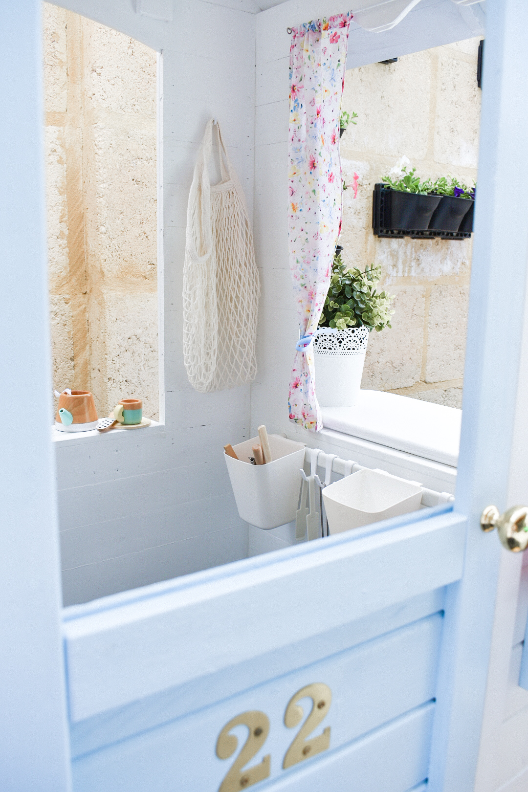 4. Decorating and Storage. From inspiration of other cubby houses I wanted to add a little bell as I think they look super adorable on. I got this one from Bunnings. The brass door knob and brass number 22 was from Bunnings too. The little white baskets inside I picked up from Bunnings and attached them to the wood with a little screw through the holes on the basket. I also got a couple of little screw in hooks to hang the apron, bags and shop signs on. The white rail, container and hooks under the window frame is from Ikea.