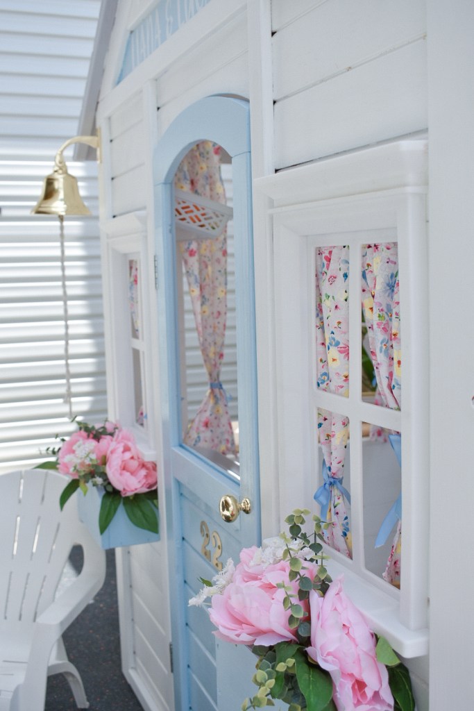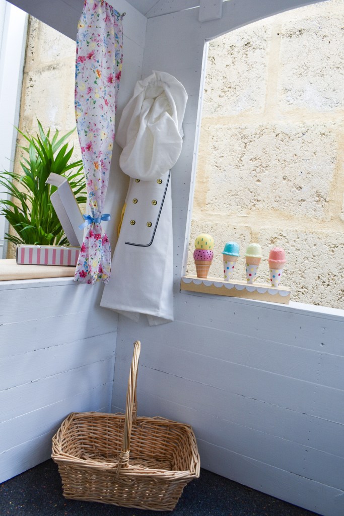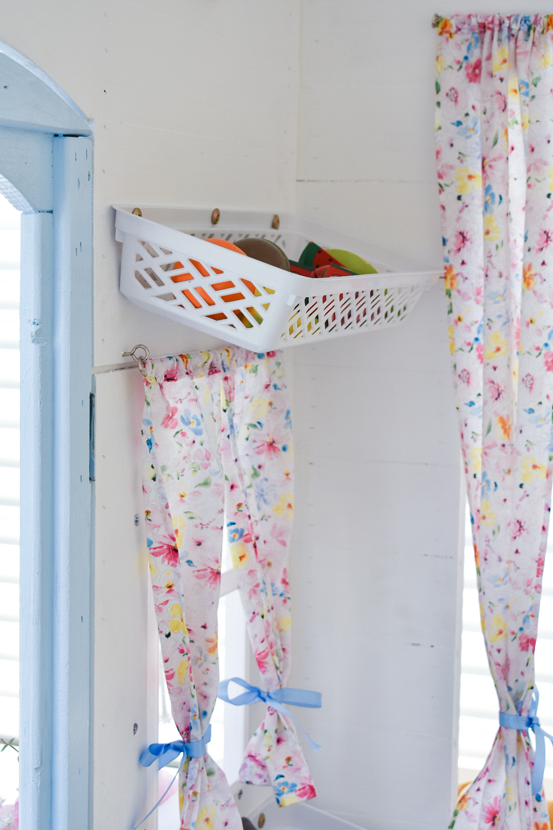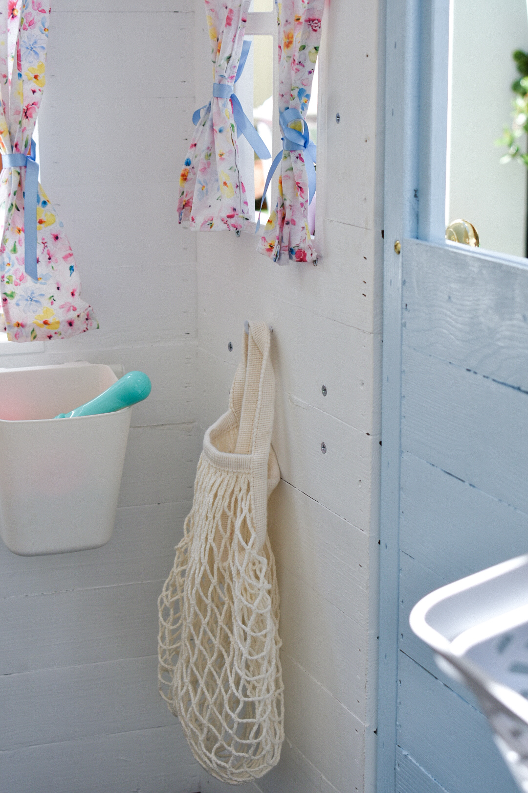 4. Decorating and Storage. From inspiration of other cubby houses I wanted to add a little bell as I think they look super adorable on. I got this one from Bunnings. The brass door knob and brass number 22 was from Bunnings too. The little white baskets inside I picked up from Bunnings and attached them to the wood with a little screw through the holes on the basket. I also got a couple of little screw in hooks to hang the apron, bags and shop signs on. The white rail, container and hooks under the window frame is from Ikea.