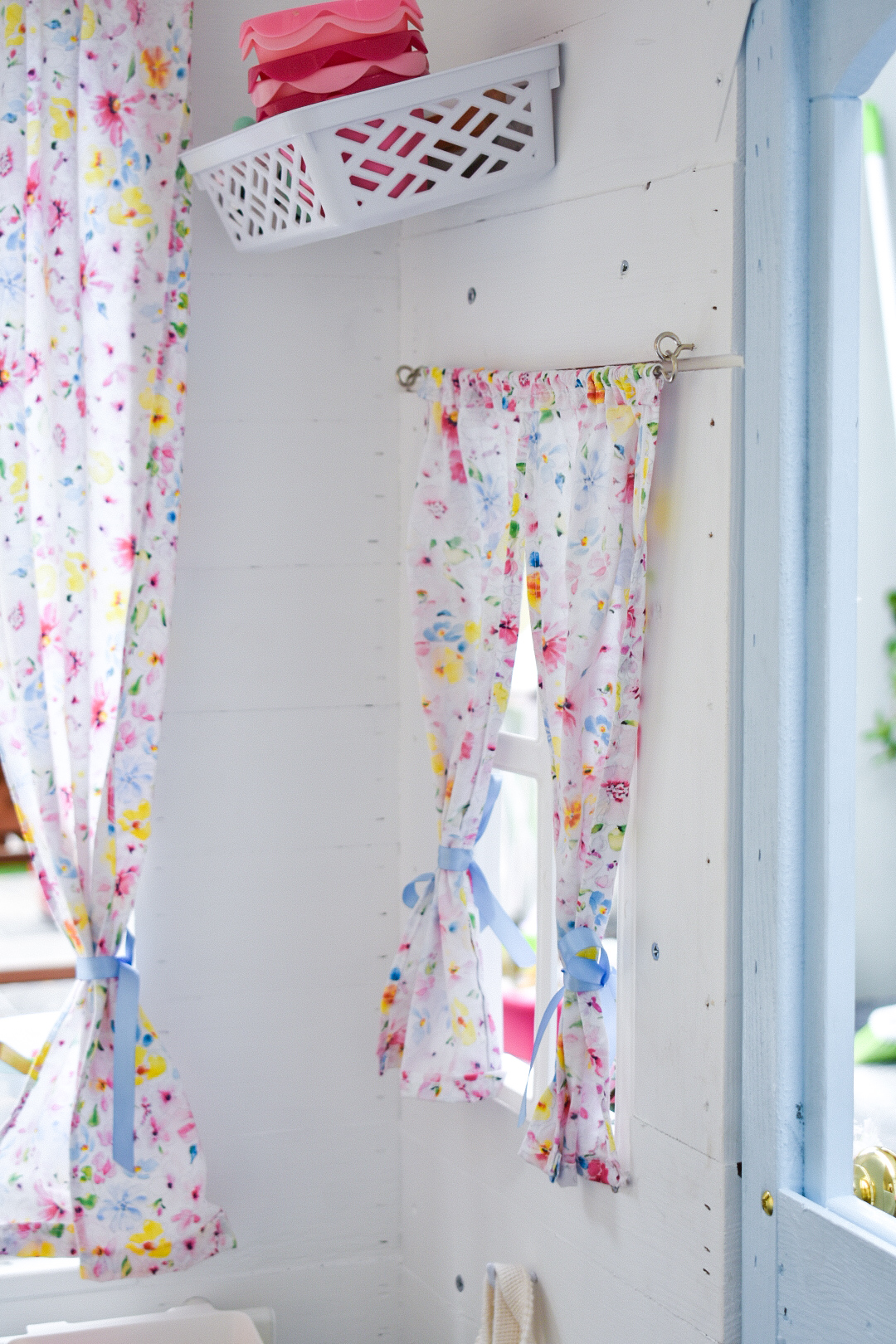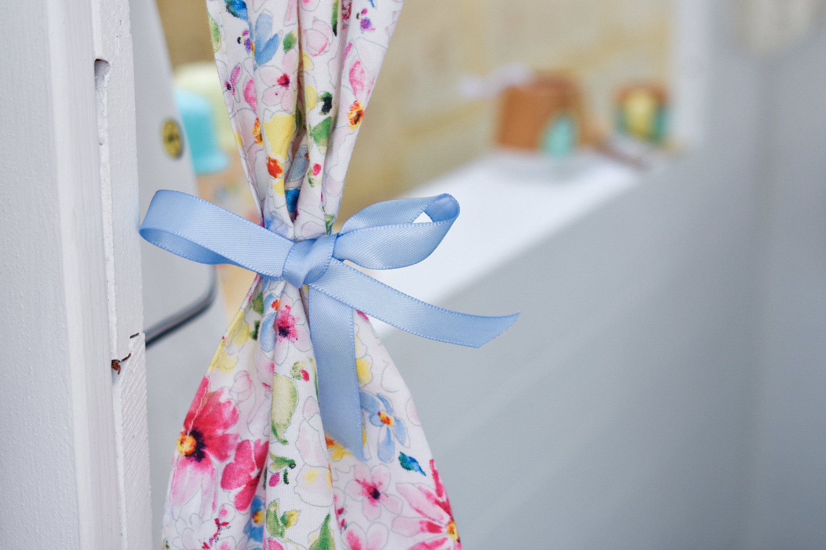 3. Curtains. From some left over fabric I made the curtains. I cut them to size and hemmed all sides, the top hem I did a little wider to fit the stretch wire through. You can find stretch wire from Spotlight. It’s really easy to use just cut the wire to size and screw the included little hooks to each end, then screw the little eyes into the wood in the position you want to hang and attach the hooks to the eyes and your done. With a little ribbon I tied a bow on each piece of fabric to finish them off.