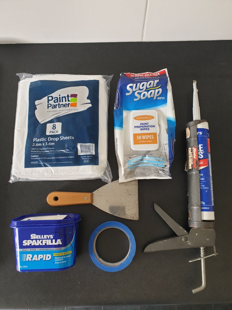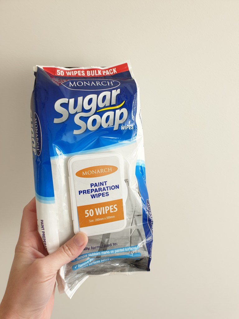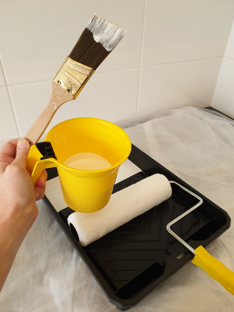 Preparation is key when painting. Firstly clear out the whole room. It’s important to wash down your walls, especially as this was the laundry, the amount of lint and dust that builds up will surprise you. I find it easiest to use the sugar soap wipes, super easy to wipe down all the walls. Then I prepare all the ceiling cornices, our house is 5 years old and a lot of our cornices have cracks. A little trick my mum taught me is to go along with no more gaps and a wet cloth and cover all the cracks. It comes up as new again. Fill any holes in the walls with filler and then finally prepare the painting area with masking tape and plastic sheets. This makes painting a lot quicker and stops getting paint on unwanted areas. Just make sure you don’t leave the masking tape on for too long as it might take the paint with it or take paint from the door frames etc. I’m all for making things easier and having the right tools for the job, so I highly recommend getting a little paint holder with a handle and paint brush holder, like the yellow one in the pic below.
