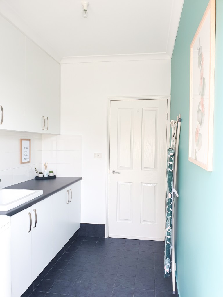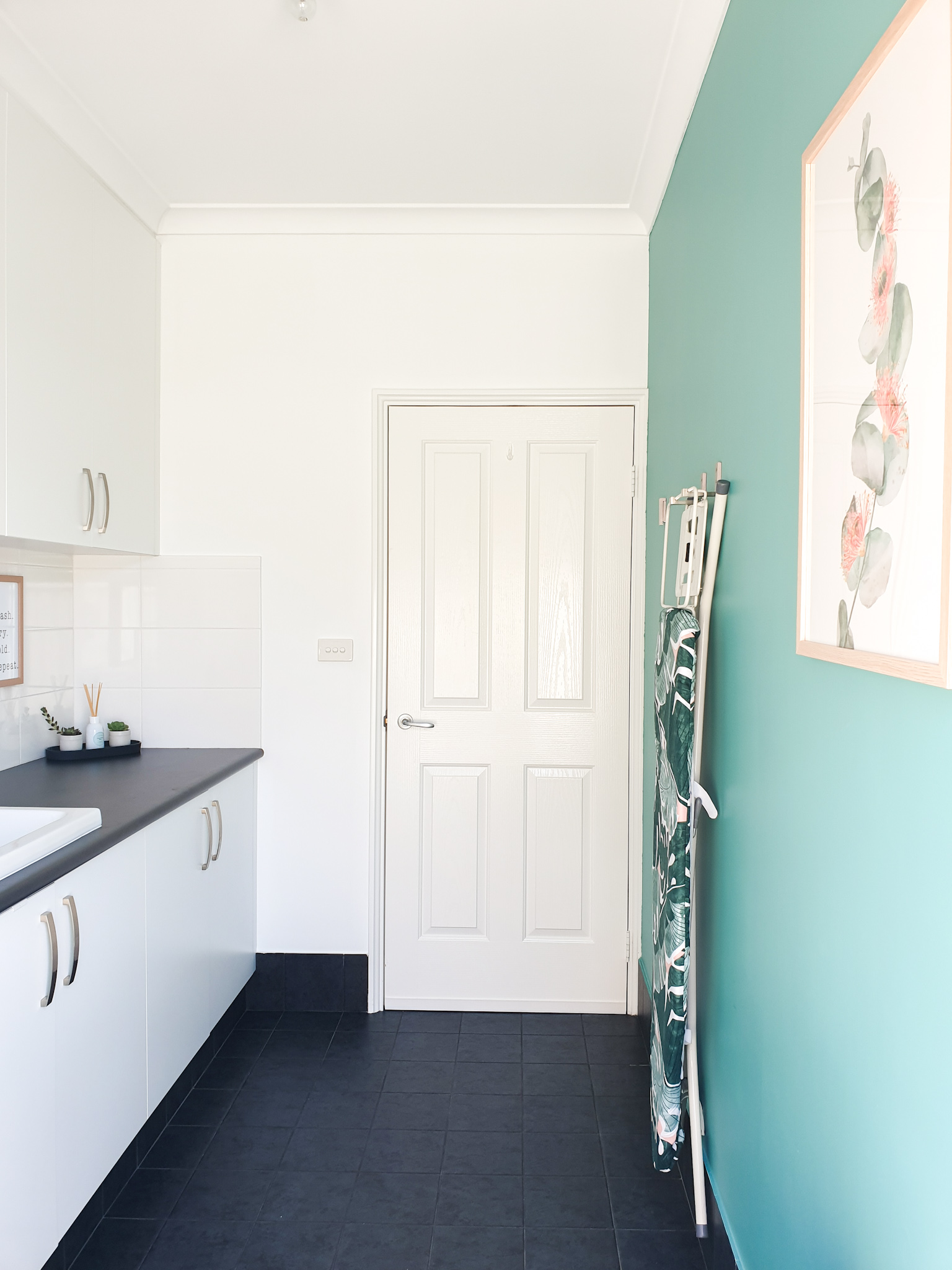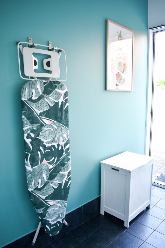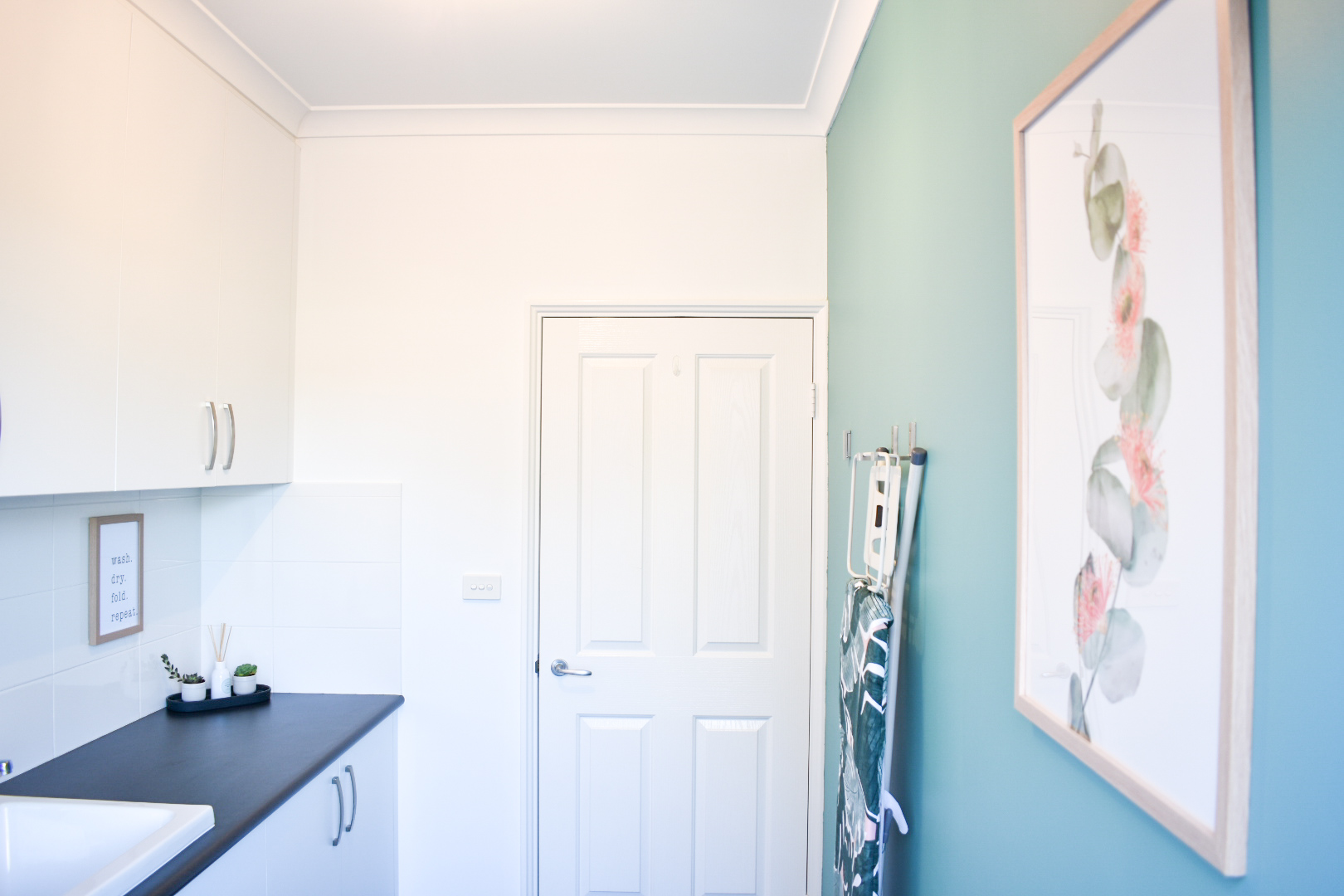 For the finishing touches I picked up a couple of pieces with the same colour as the feature wall in it to bring both sides of the laundry together as one room. eg The little mini succulents, diffuser, hanging wall art and I came across the perfect matching iron board cover in Kmart. To add a little more warmth and earthy feel I added the timber frames to both the hanging wall art and the wash, dry, fold, repeat print. Take the sample of your paint colour with you to easily match up or get the right contrast you are looking for.