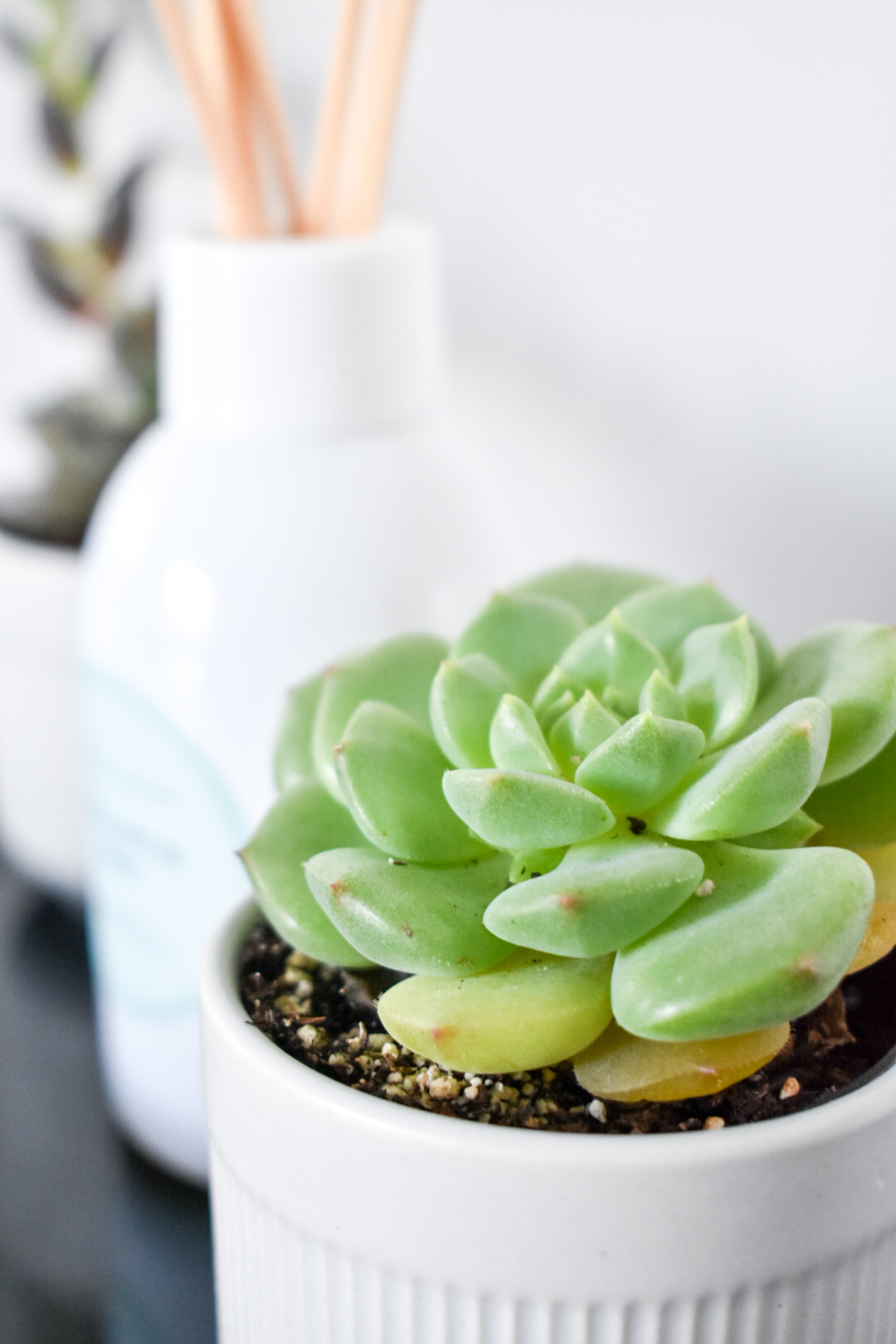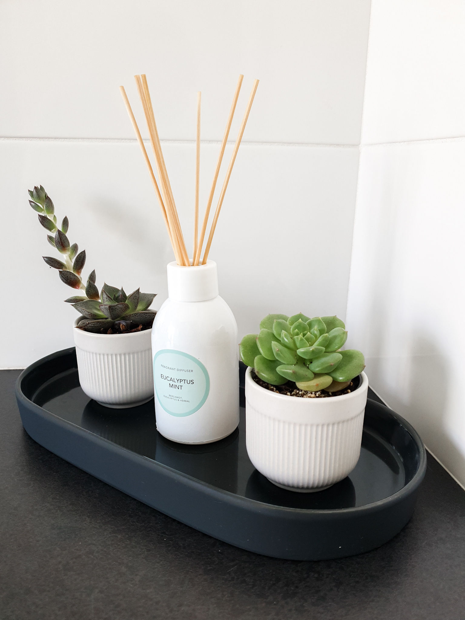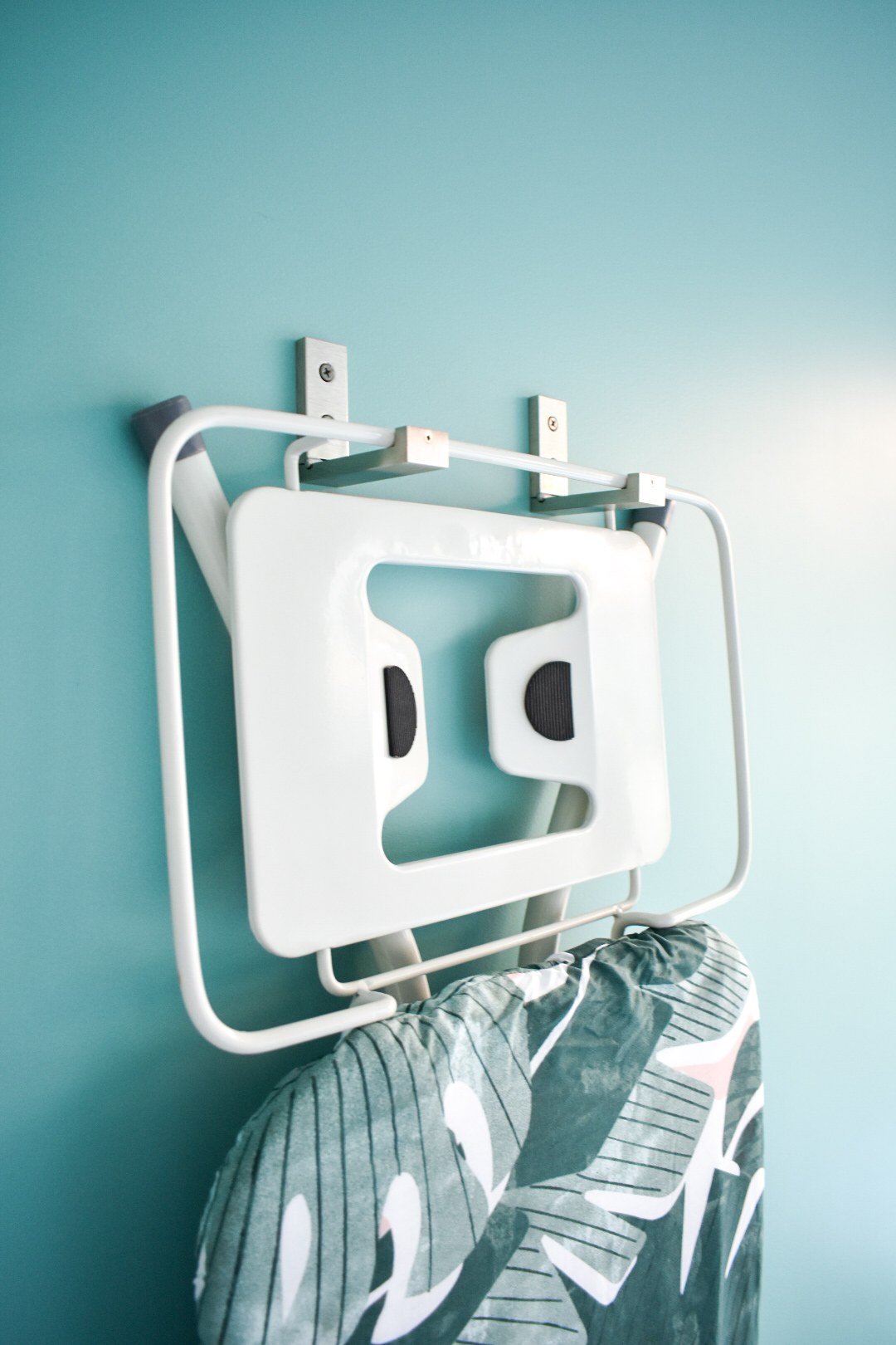 For the finishing touches I picked up a couple of pieces with the same colour as the feature wall in it to bring both sides of the laundry together as one room. eg The little mini succulents, diffuser, hanging wall art and I came across the perfect matching iron board cover in Kmart. To add a little more warmth and earthy feel I added the timber frames to both the hanging wall art and the wash, dry, fold, repeat print. Take the sample of your paint colour with you to easily match up or get the right contrast you are looking for.