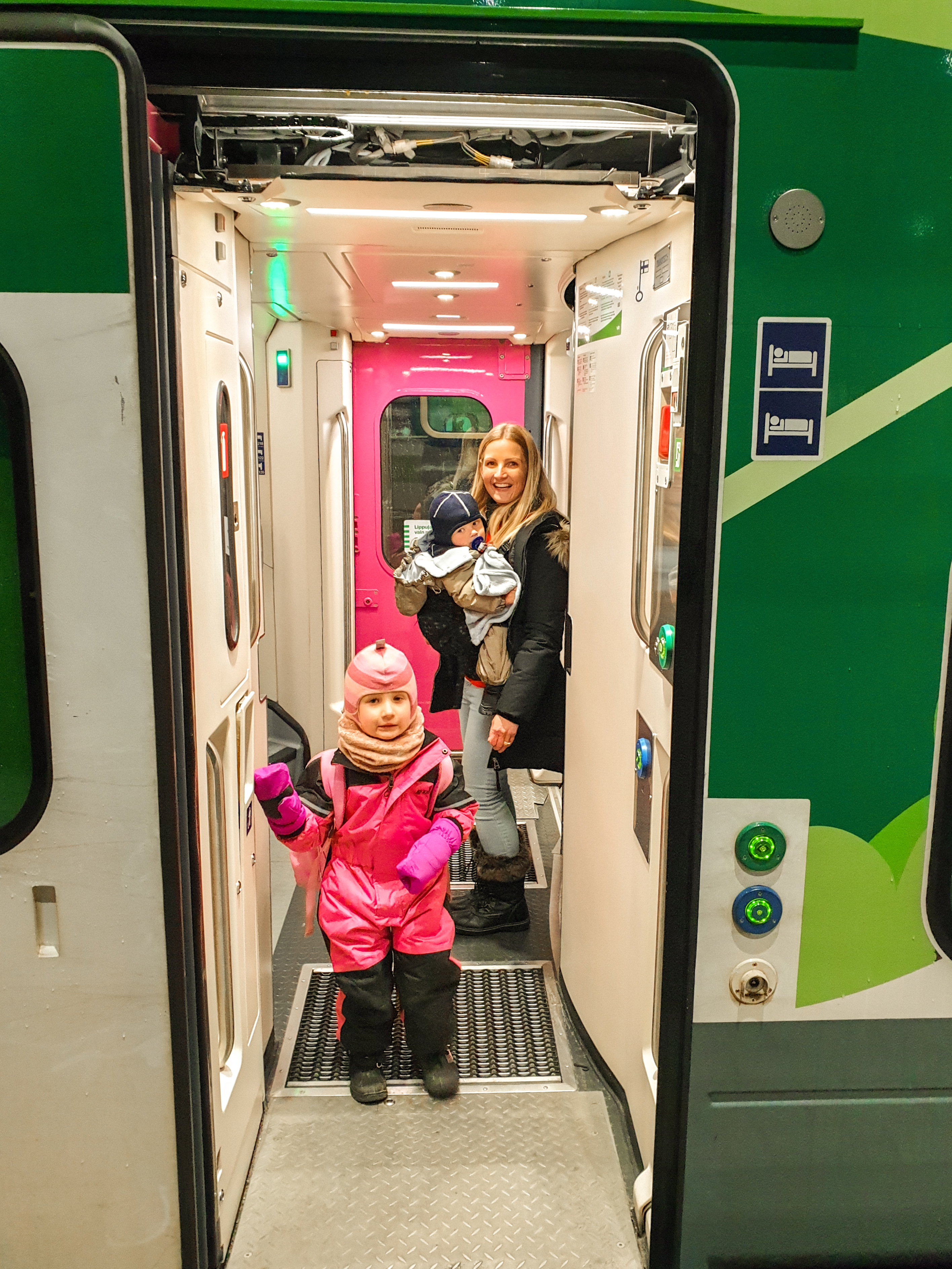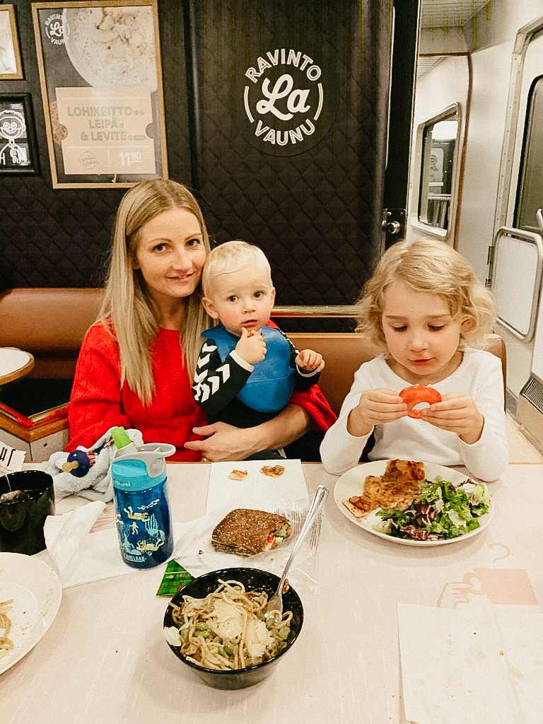 The train ride takes around 12 hours, leaving Helsinki at 6:49pm and arriving in Rovaniemi at 7:13am. The cabins have a tiny little en suite with toilet and shower. We had a double cabin which has 2 single beds on top of each other. Liana and I had the top bunk and Jarrod and Luca had the bottom (see tips below for booking with children).