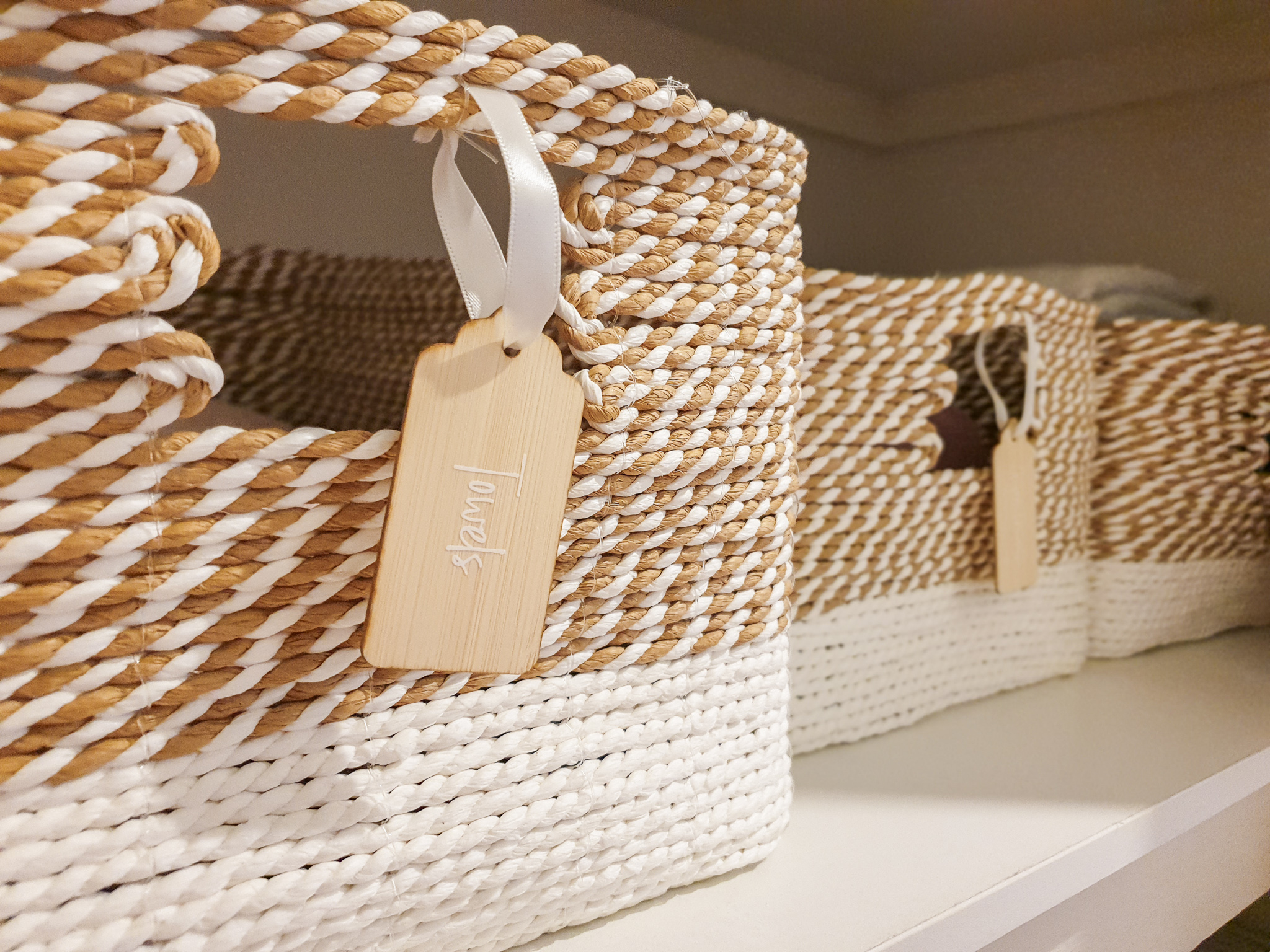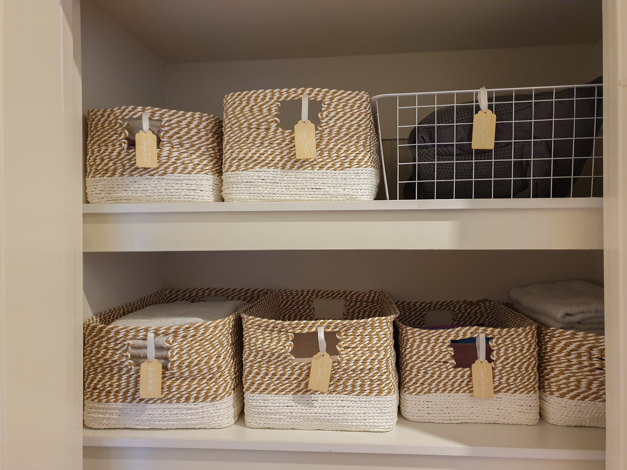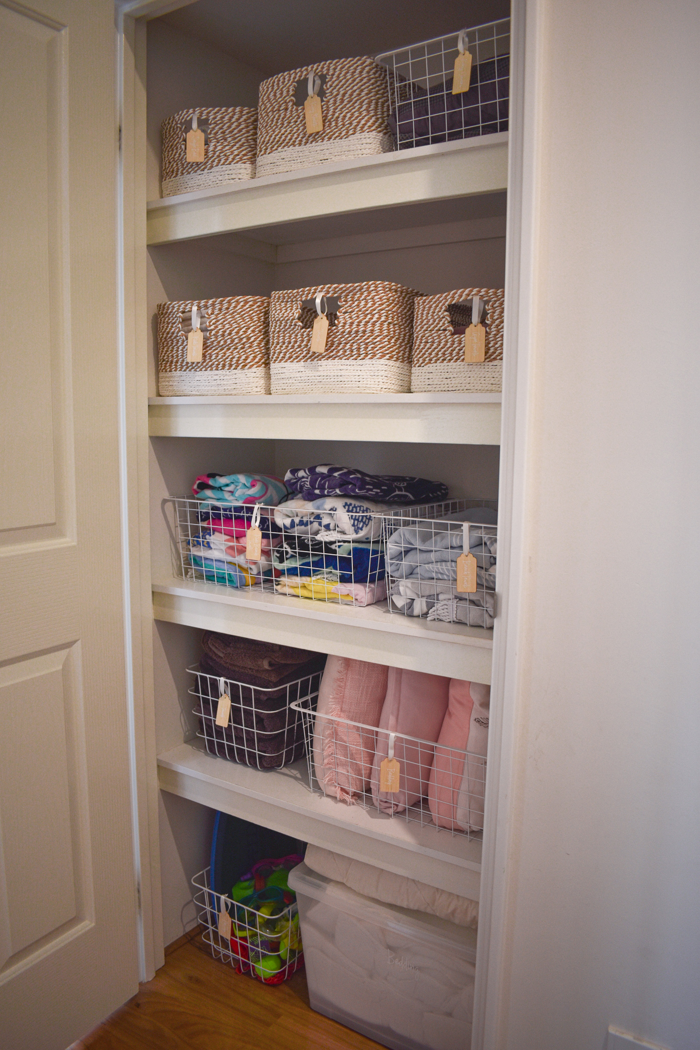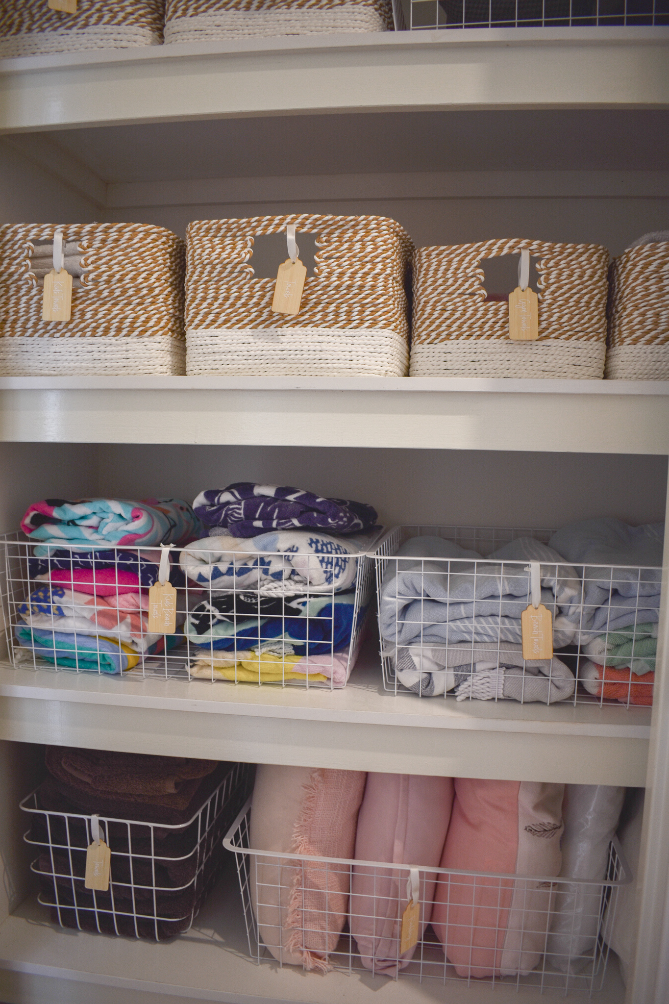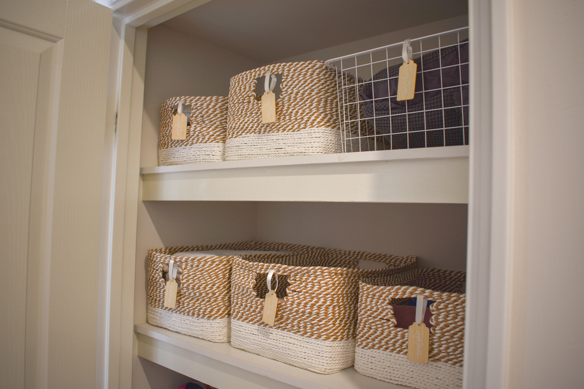 I knew that I wanted to make the space lighter in the smaller linen closet than what it was because it’s in a dark part of the house, no direct sunlight and in a short little hall way. So I went with majority white wire baskets and the white with a natural rope like basket to bring a bit of colour but keep it neutral,