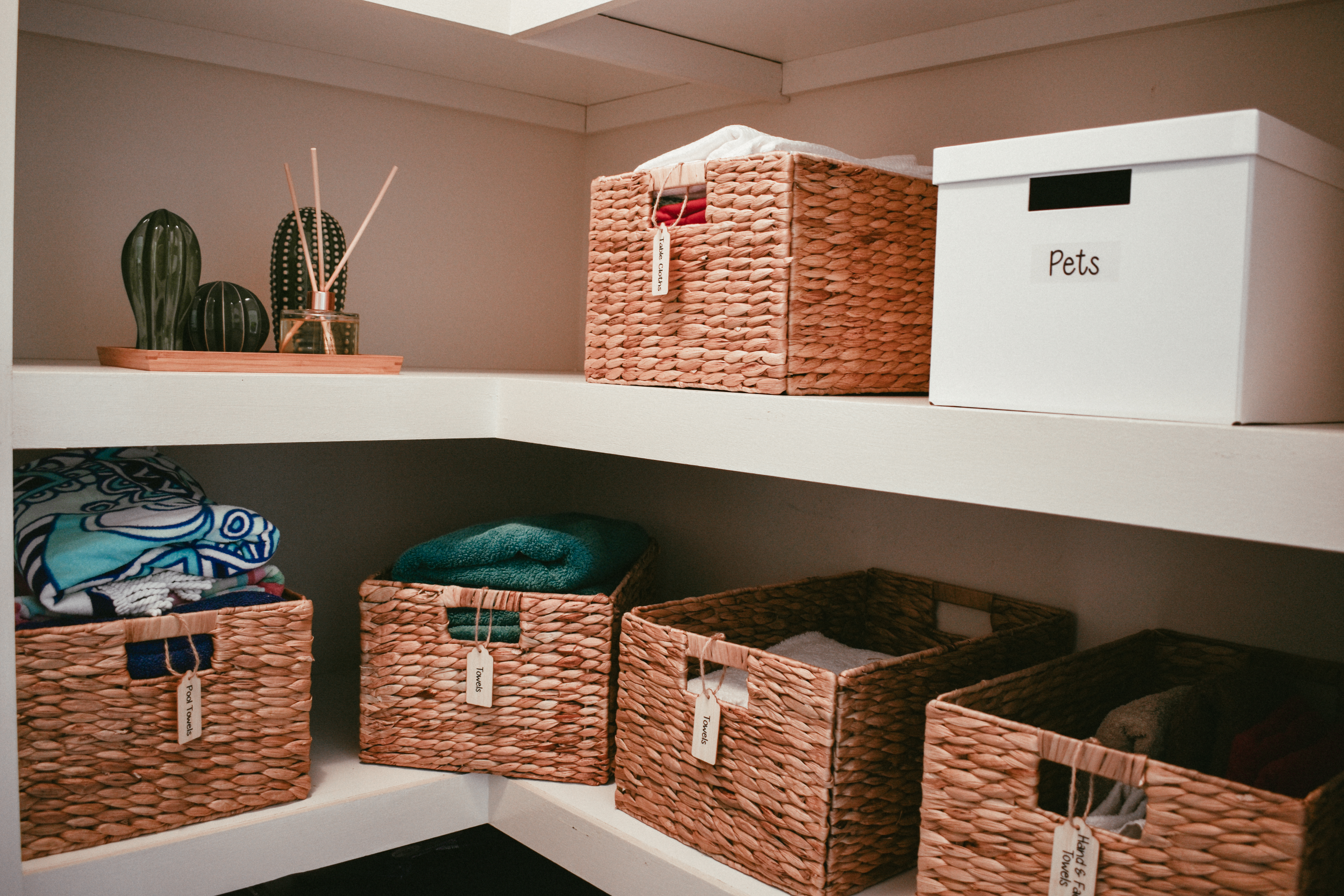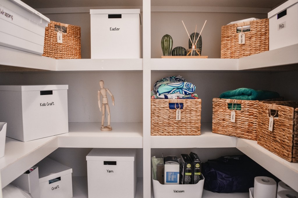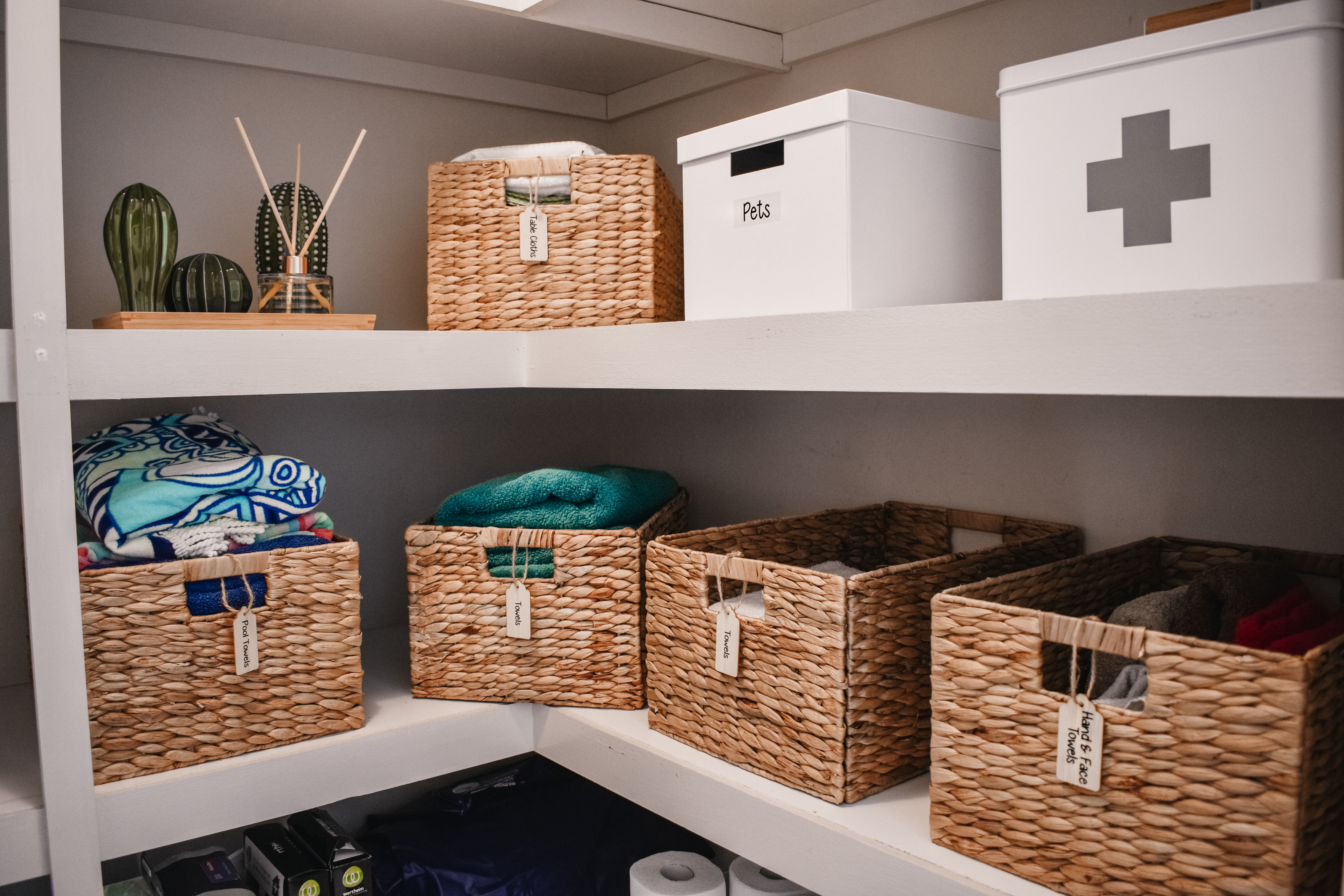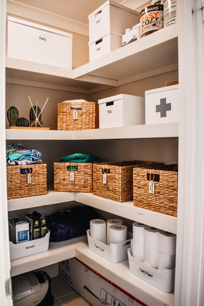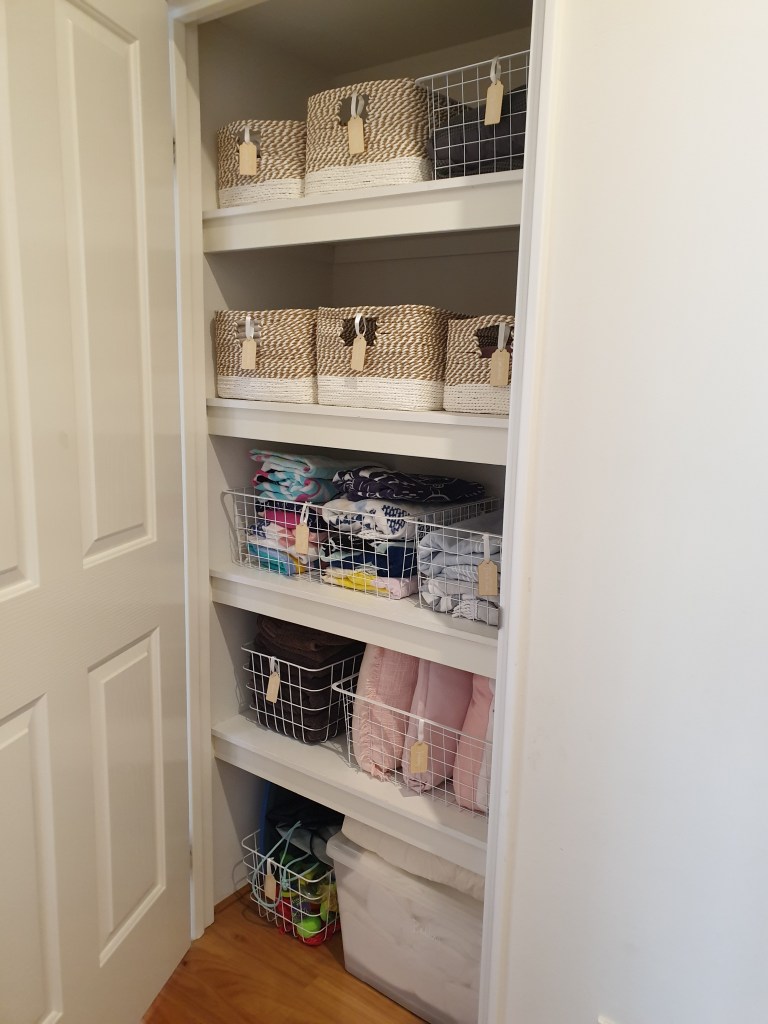 All the storage baskets I used for my Linen Cupboard were all from Bunnings, I found they had the better options for the larger storage baskets and cheaper. Kmart is also another good place for storage options.