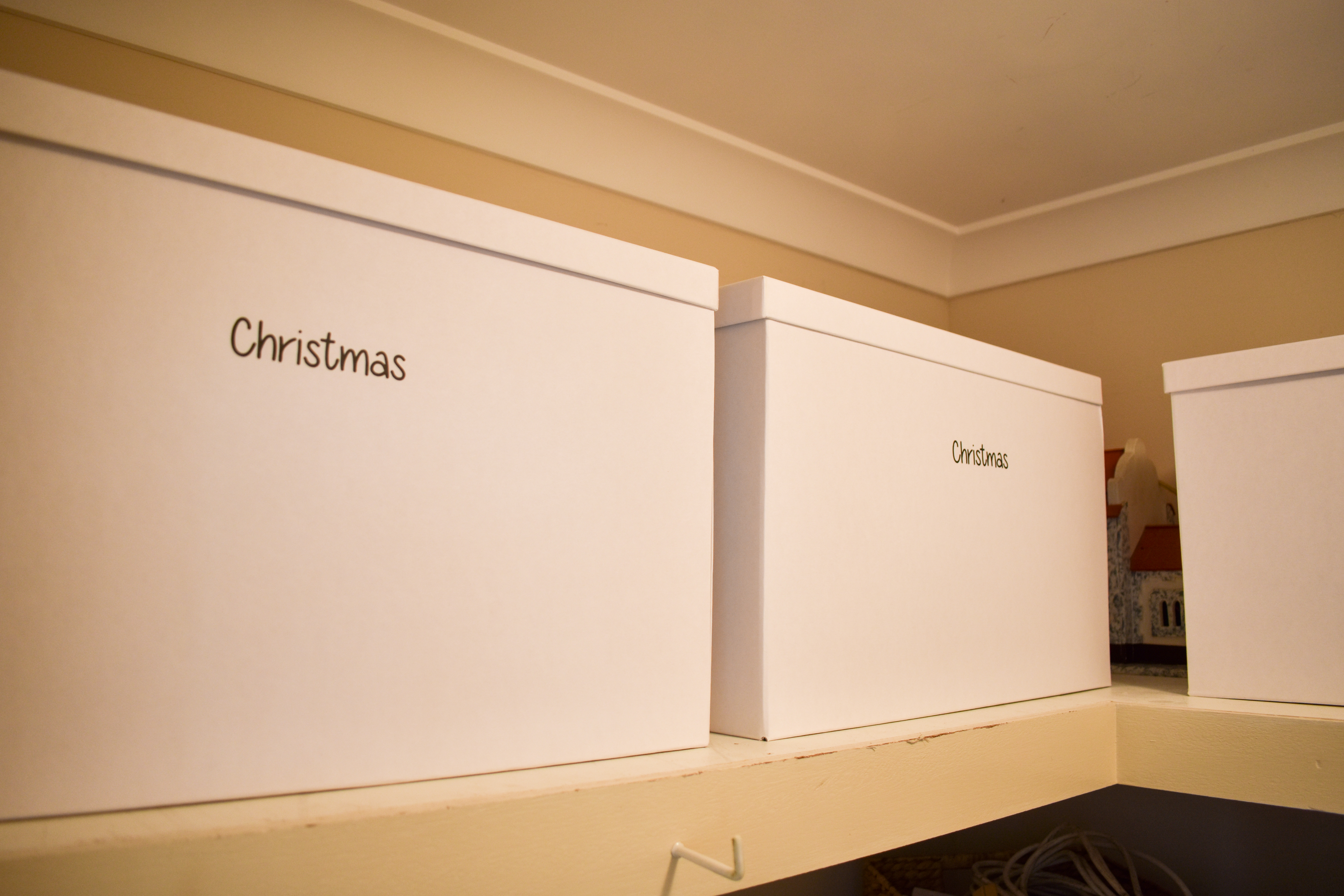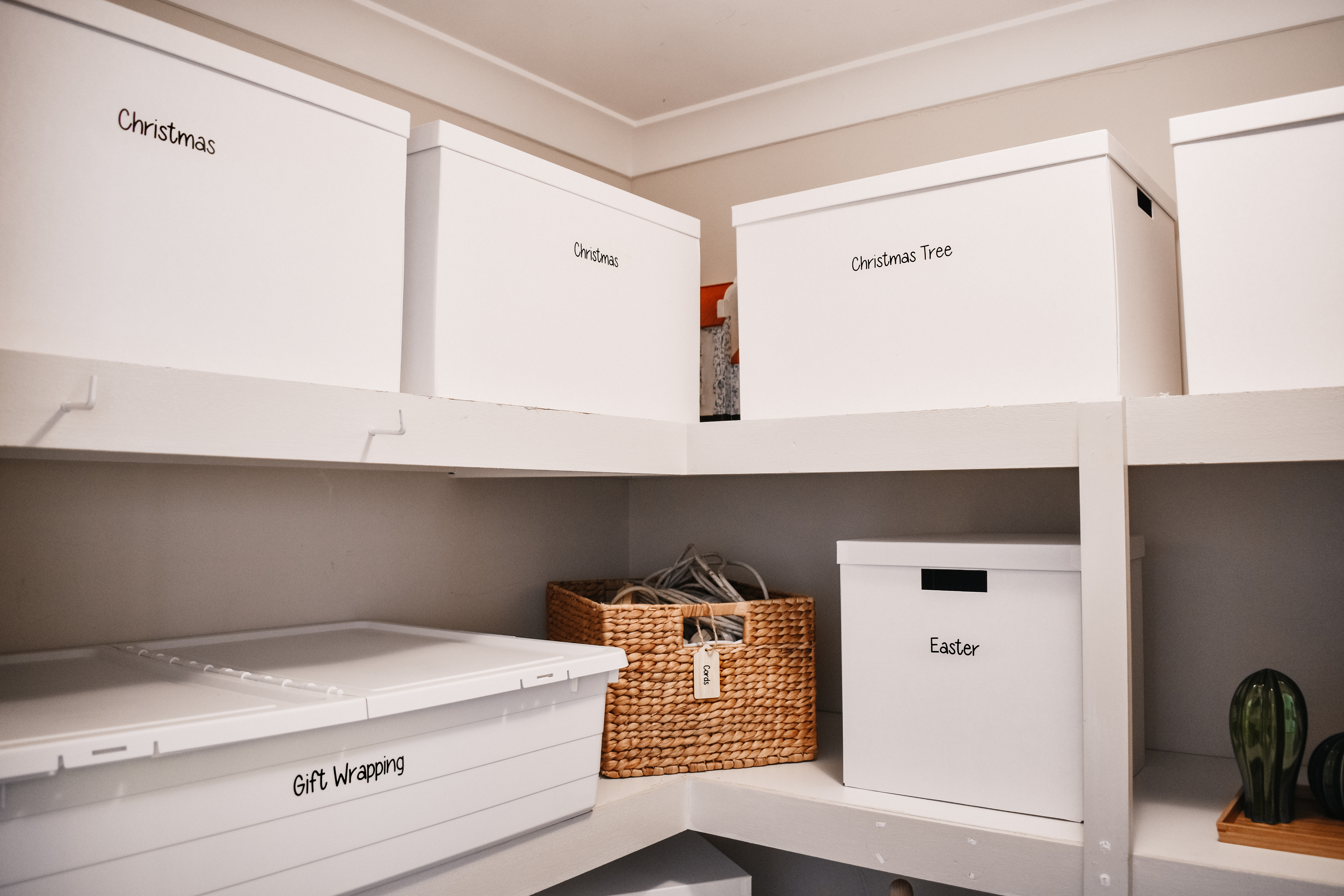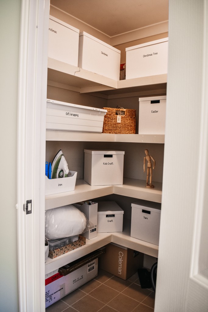 The storage solution we used on the large linen cupboard (my mums) was mainly the white Ikea Tjena boxes as she had so much storage space and the majority of the items stored in there are things that you don’t use everyday. By storing them in these boxes with lids, it makes them easy to label and the items are tucked away neatly not collecting dust.
