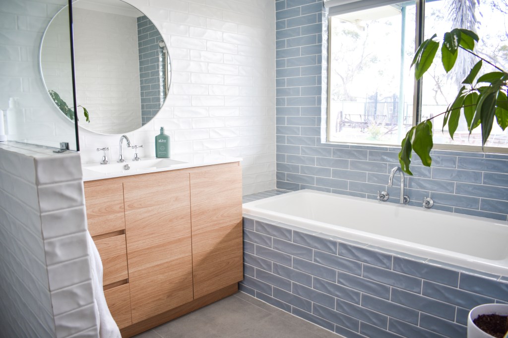 Bath, cabinet and tapware from Reece Plumping